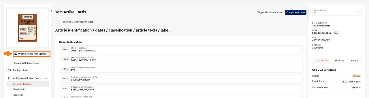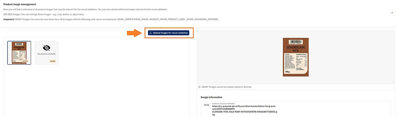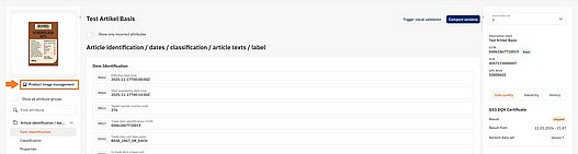 After a successful upload, the images will appear on the item detail page under Product image management. You can open the detail page by clicking the corresponding GTIN in the Item List.