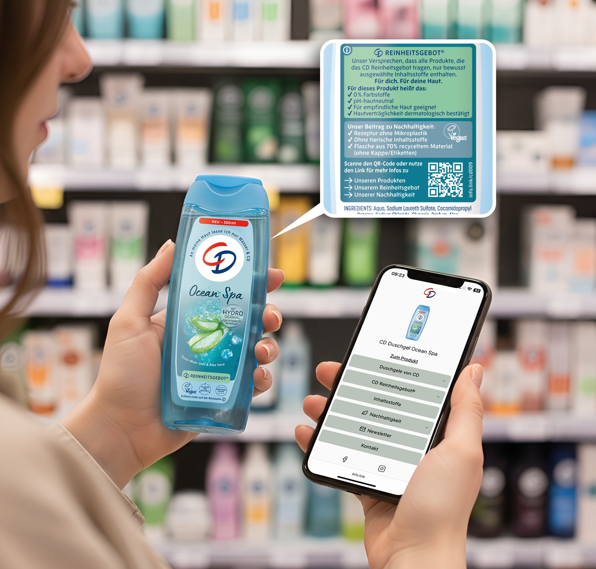 Mit dem Relaunch der Duschkategorie integriert CD auf allen Verpackungen einen QR-Code, der Konsument:innen per Smartphone-Scan zu einem Digital Label auf info.link leitet. Dort finden sie ausführliche Informationen zu Inhaltsstoffen, Nachhaltigkeitsmerkmalen und Claims sowie Details zum bekannten Reinheitsgebot der Marke. Zudem stehen dort Hinweise für die Anwendung und Pflegetipps, die den Übergang zwischen physischem Produkt im Regal und digitaler Markenwelt schaffen. So wird ein direkter, jederzeit mobil verfügbarer Zugang zur Markenkommunikation möglich – ohne App-Zwang und mit einem klaren Mehrwert für das Einkaufserlebnis.