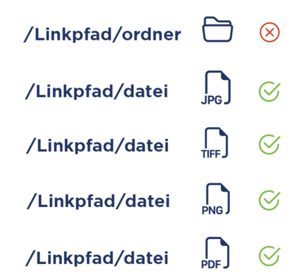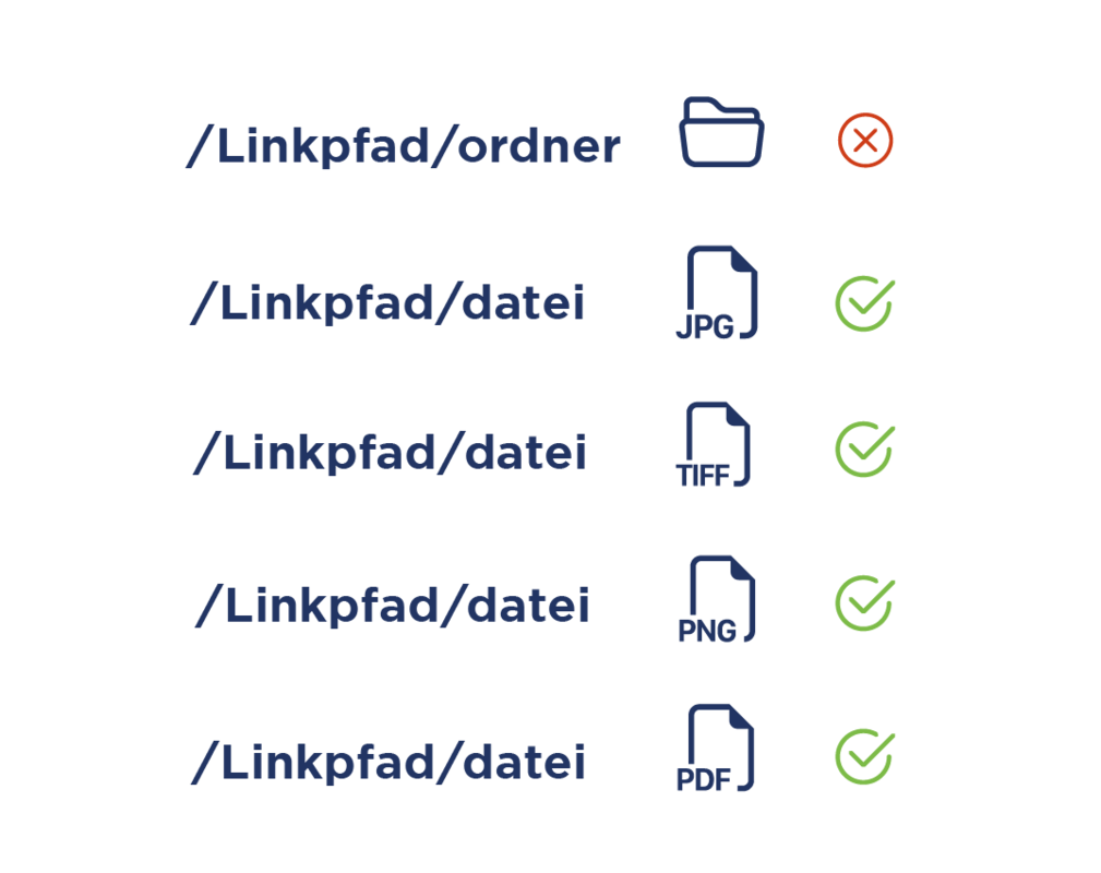 Wenn Sie Bilder per Link liefern, muss der Link direkt zu der Bilddatei und ausschließlich zu der entsprechenden Bilddatei führen. Das bedeutet: Der Link darf nicht zu einem Ordner mit mehreren einzelnen Bilddateien verlinken. Erlaubt, aber nicht erforderlich, sind Download-Links – das Bild muss also nicht automatisch heruntergeladen werden.