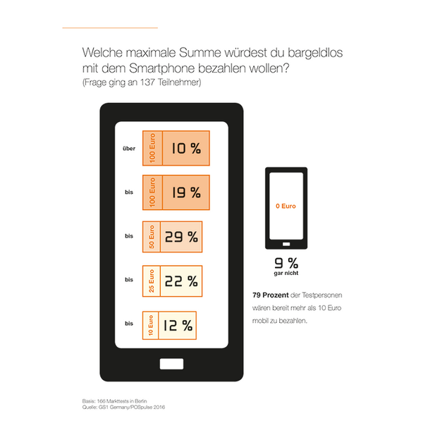 - 79 Prozent der Testpersonen wären bereit mehr als 10 Euro mobil zu bezahlen. (Quelle: GS1 Germany/POSpulse)