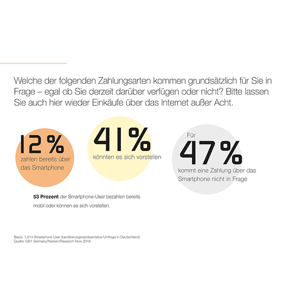 - 53 Prozent der Smartphone-User bezahlen bereits mobil oder können es sich vorstellen. (Quelle: GS1 Germany/Nielsen/Research Now)